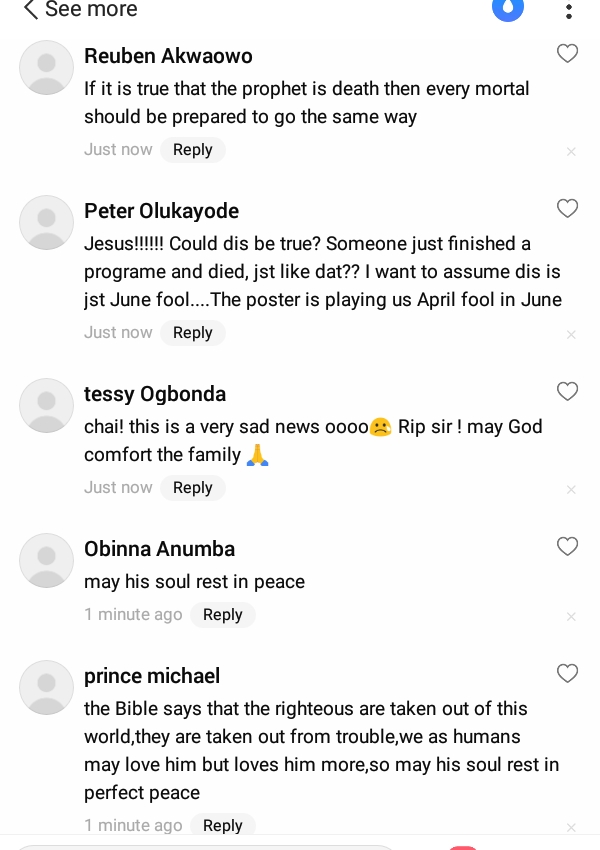 Meanwhile, Nigerians and followers are reacting to the news of T. B. Joshua’s death. Some have confirmed the news to be true. See the Screenshots of the reactions.