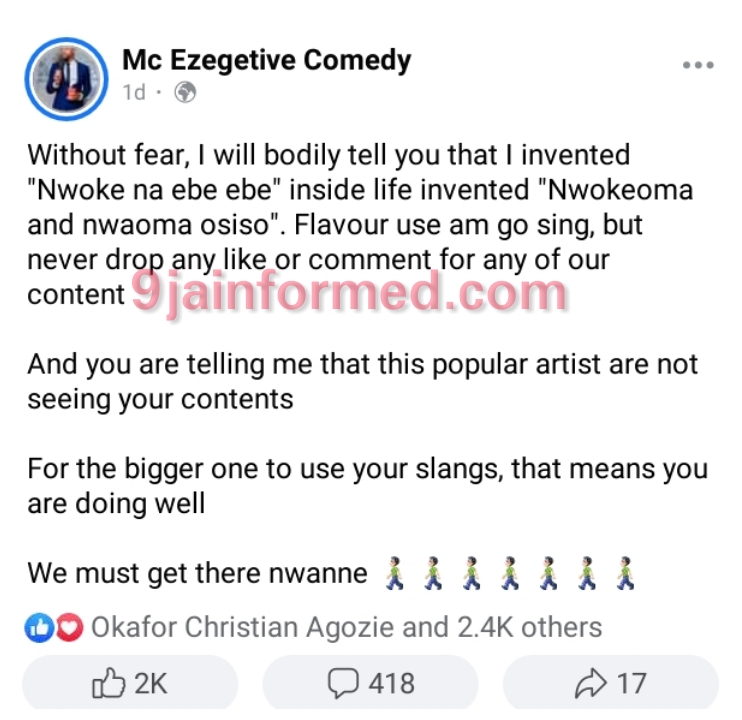 “Without fear, I will bodily tell you that I invented “Nwoke na ebe ebe” inside life invented “Nwokeoma and nwaoma osiso”. Flavour use am go sing, but never drop any like or comment for any of our content