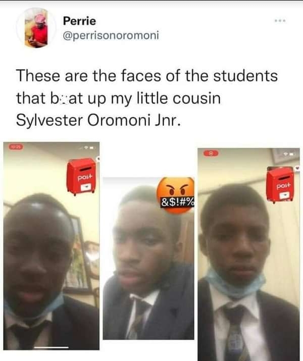 And they just returned for 1st term and probably carried the case over again. Now, according to the story, Silvester was locked in the cupboard for 2 days by the Senior boys that beat him up; some of those guys are in the same class with his sister.