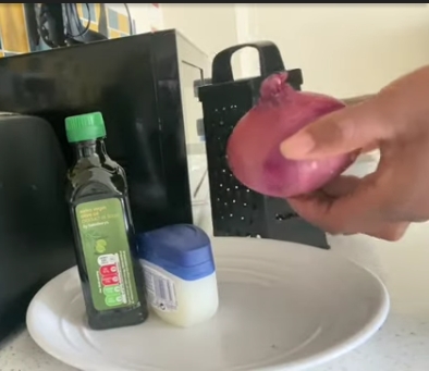Use a baby spoon to scoop a spoonful of vaseline once into the onions pulp. Use the same spoon measurement for the olive or coconut oil (once). Pour all of them into the onions pulp in the plate and start mixing with the baby spoon.