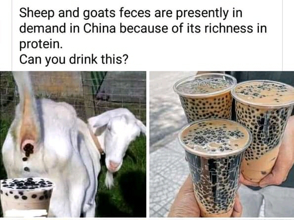 The truth is that post is a lie. The name of the drink is called Boba Pearls. According to Leadstories.com: “Is a drink containing sheep feces now in demand in China because it is high in protein and also can make a person high? No, that’s not true: This spoof post includes genuine images showing a popular Taiwanese drink called bubble tea, or boba tea. This drink can be made to order with several choices of the type of tea and the type of bubbles. The sweet chewy balls are usually black tapioca pearls.